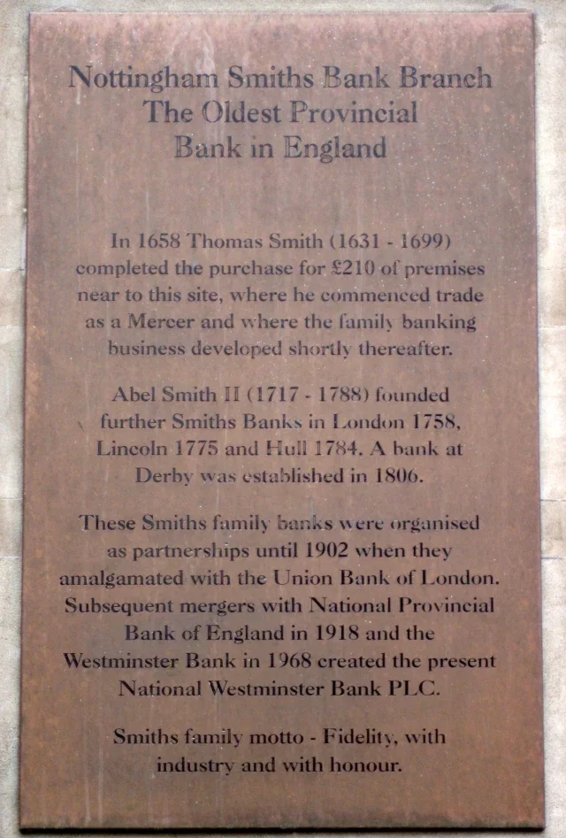 Nature of Link: Family members were slave-ownersAbel Smith II was a banker for the Smiths Bank, a family owned business that was established by his grandfather, Thomas Smith (1631-1699), in the mid-seventeenth century. He took over its management upon his father's death in 1757 and in 1758 entered into a partnership with John Payne (1708-1764), a London linen draper, and formed Smith, Payne & Smiths bank which had offices in both London and Nottingham. Abel went on to found two other branches of the Smiths’ bank at Lincoln in 1775 and Hull in 1784, for which he is locally celebrated and memorialised by the large plaque mounted on the side of the NatWest Bank’s exterior wall in Nottingham City Centre.